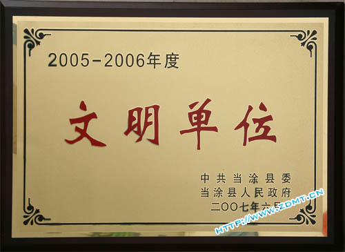 近日,我公司被中共當涂縣委、當涂縣人民政府聯合授予“當涂縣2005-2006年度縣文明單位的”光榮稱號,這標志著我公司在制度化、規范化、科學化管理方面邁上了一個新的臺階。近年來,我公司穩抓精神文明建設,努力為員工、社會營造健康、和諧的工作、生活環境,做到了物質文明和精神文明建設雙豐收、雙促進。