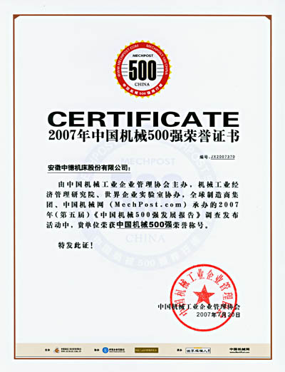 2007年《中國機械500強》暨《世界機械500強》發展報告會7月20在北京人民大會堂隆重舉行,我公司榮獲“中國機械500強”榮譽稱號,位列第370位。